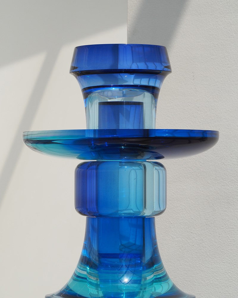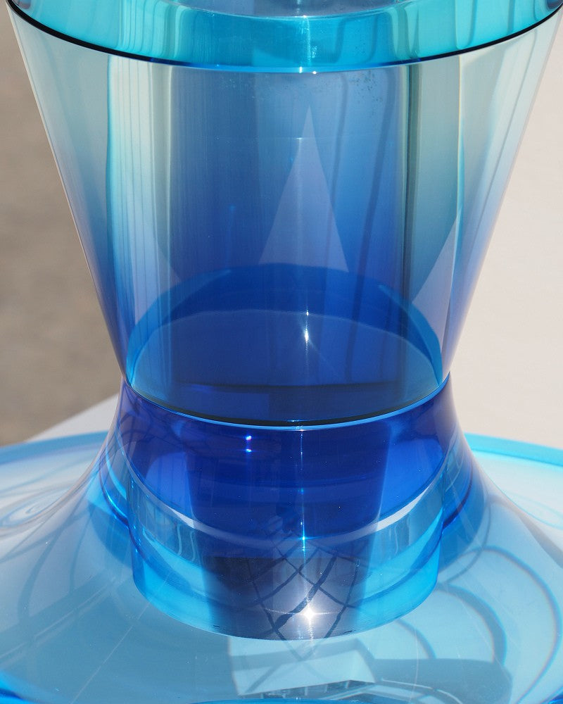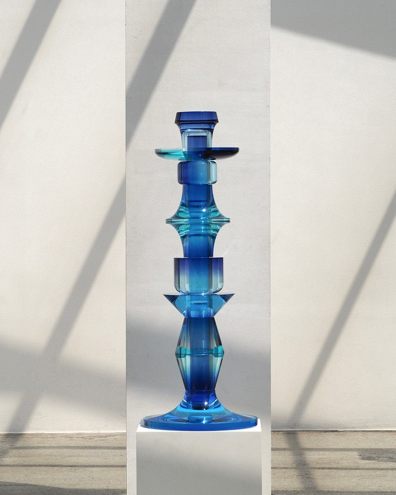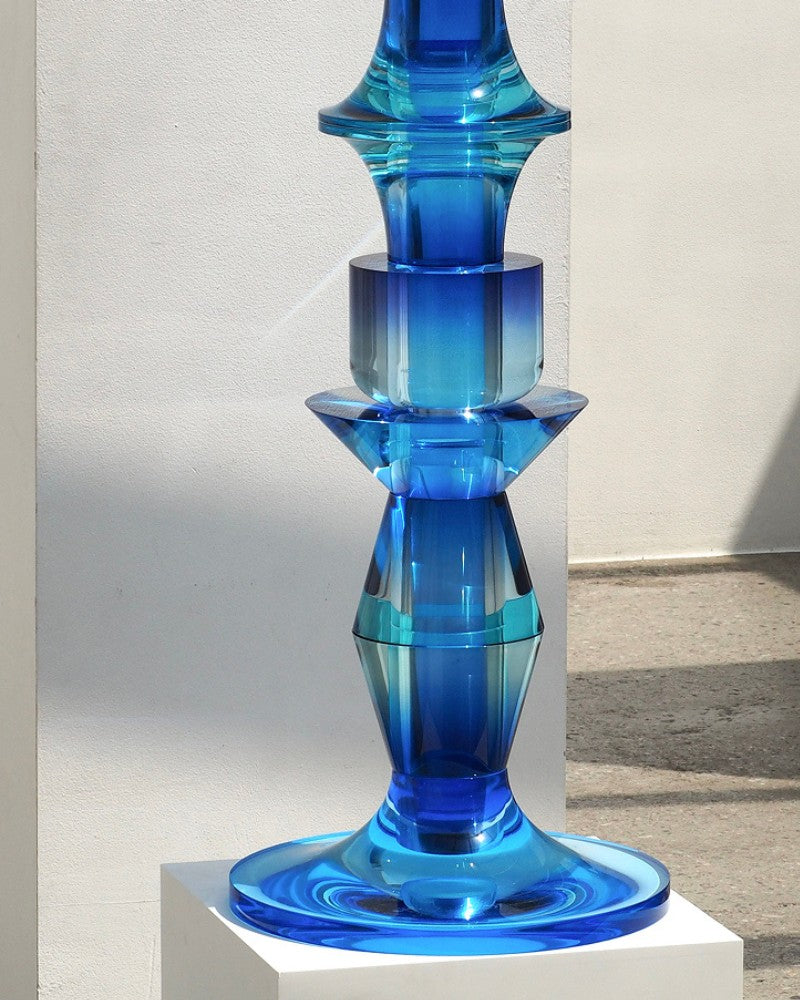 Working primarily with dyed acrylic, he develops layered and transparent surfaces that evoke the sky, clouds and water at specific moments of the day. His furniture and sculptural works blur the line between functional design and art, inviting viewers to experience color as atmosphere rather than ornament.