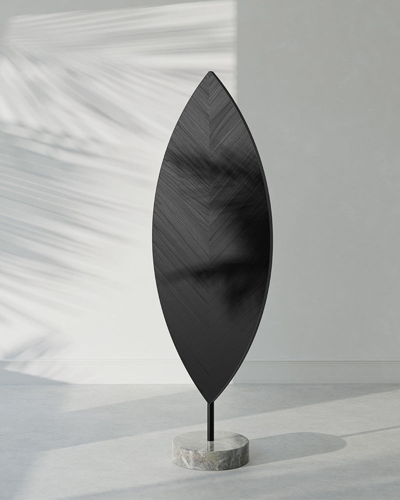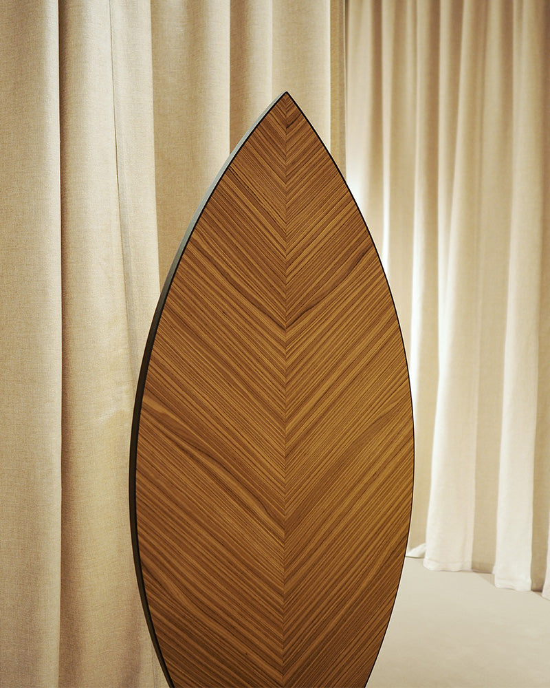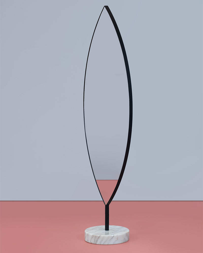 The Aglaia is a poetic masterpiece, a unique sculptural floor mirror designed with the simple intention of bringing the beauty of nature into the house. Inspired by the form of a leaf, the mirror features a rotating, wood-backed panel that can be upholstered or veneered, allowing for a dynamic, ever-changing appearance.