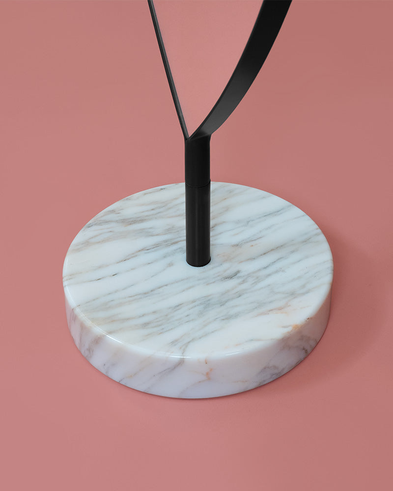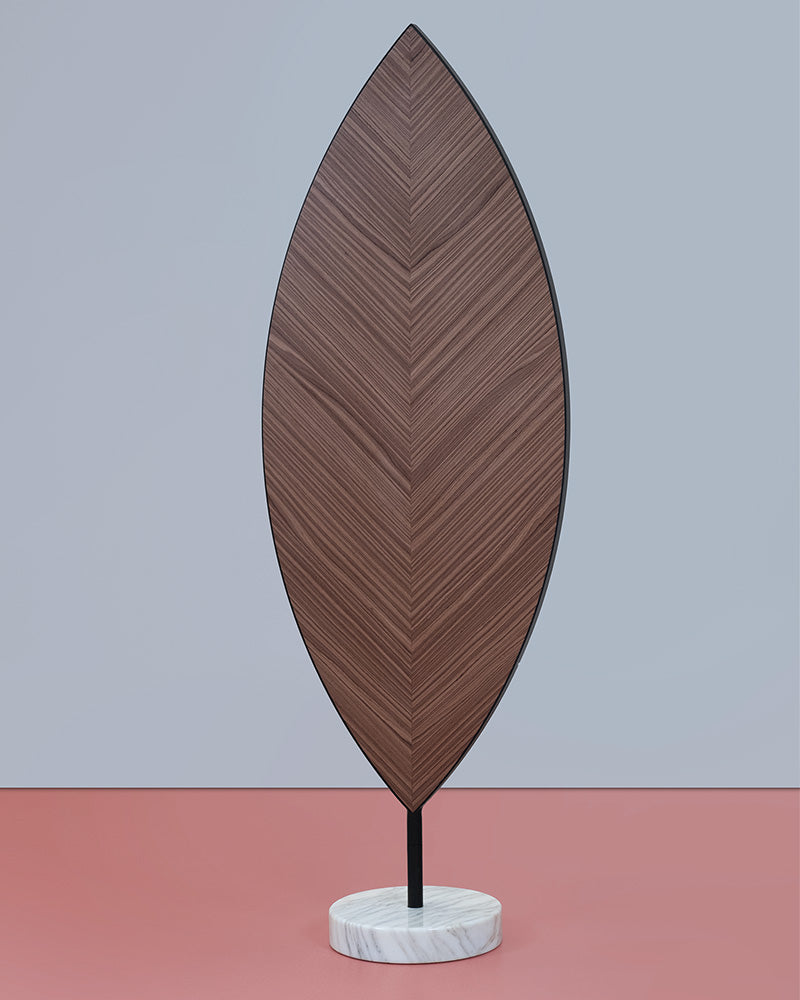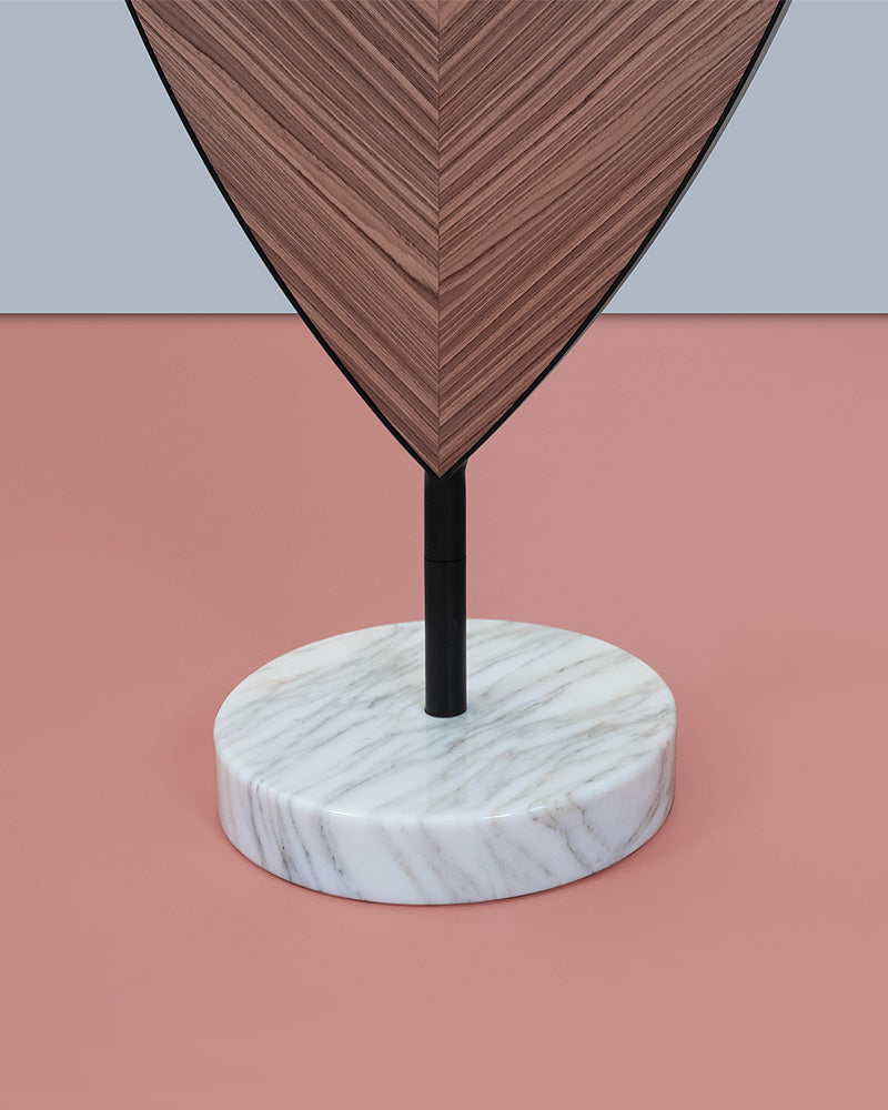 This is more than a mirror; it is an object of functional art. As a premier sculptural floor mirror, its beauty lies in the elegant details. A seam in the middle of the reverse side allows the wood grain to be mirrored, just as a leaf grows simultaneously in two directions. The entire piece is framed in elegant metal and made stable by a solid marble base.