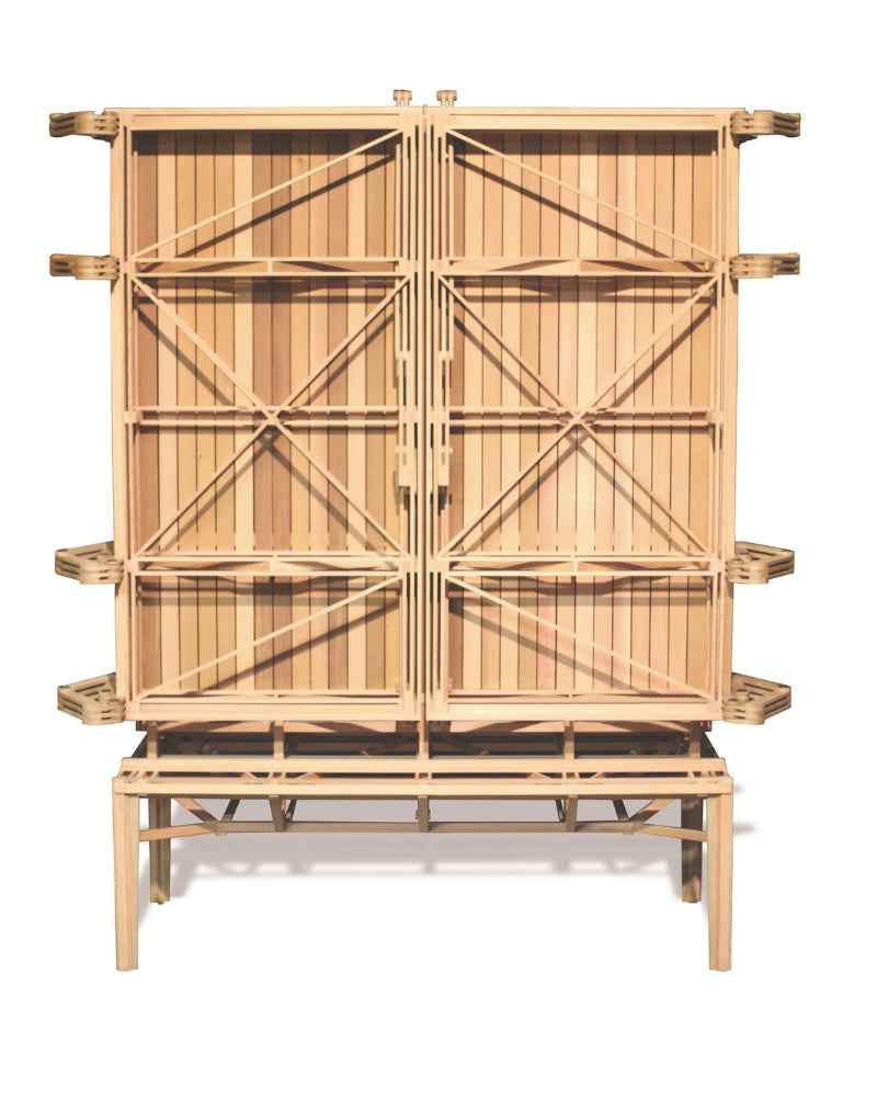 The CNSTR is a radical reinterpretation of storage, a unique architectural cabinet that turns traditional cabinetmaking inside out. Rather than concealing the framework, this design wears its construction like an exoskeleton, revealing the complex system of joints and beams that give the piece its structural integrity.