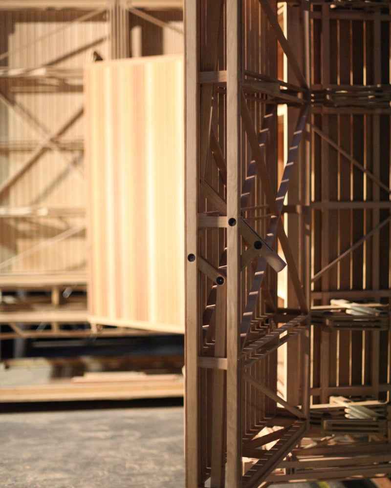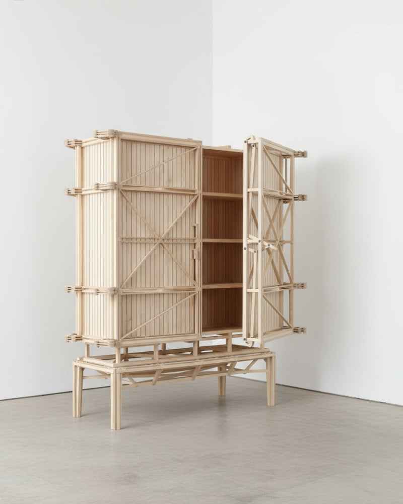 Visually reminiscent of scaffolding or intricate machinery, the cabinet is a celebration of construction (CNSTR). The mechanism is the aesthetic. Crafted with precision, the body and base are separable for transport. The design features a signature "set-upan" or function-first approach, where every slat and joint serves a purpose. Available in various configurations, from single-door units to extra-large storage systems, in finishes ranging from natural birch to solid oak.