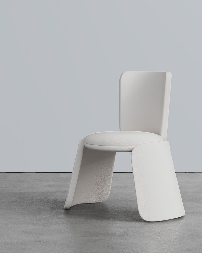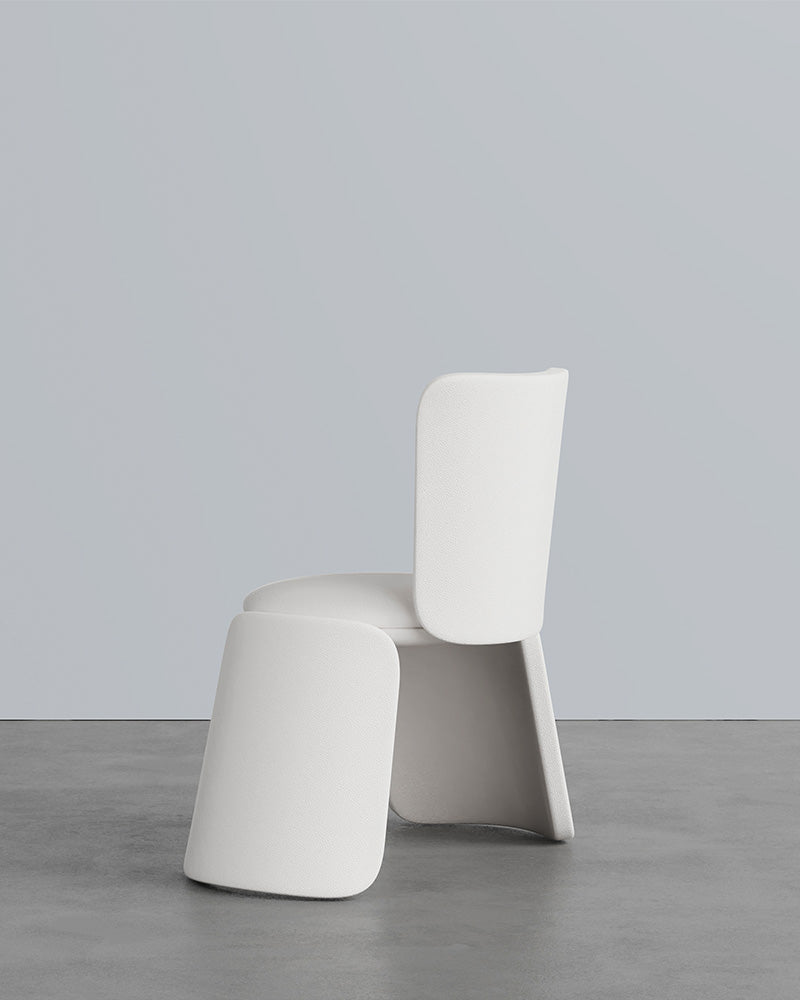The Inge is a masterpiece of conceptual design, a unique sculptural dining chair comprised of three identical upholstered pieces and a seat. Two of the pieces form the legs, while the third acts as the back, creating a contemporary and unforgettable silhouette with endless customization options.
