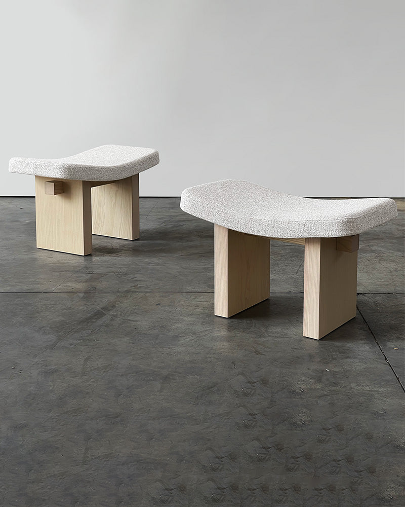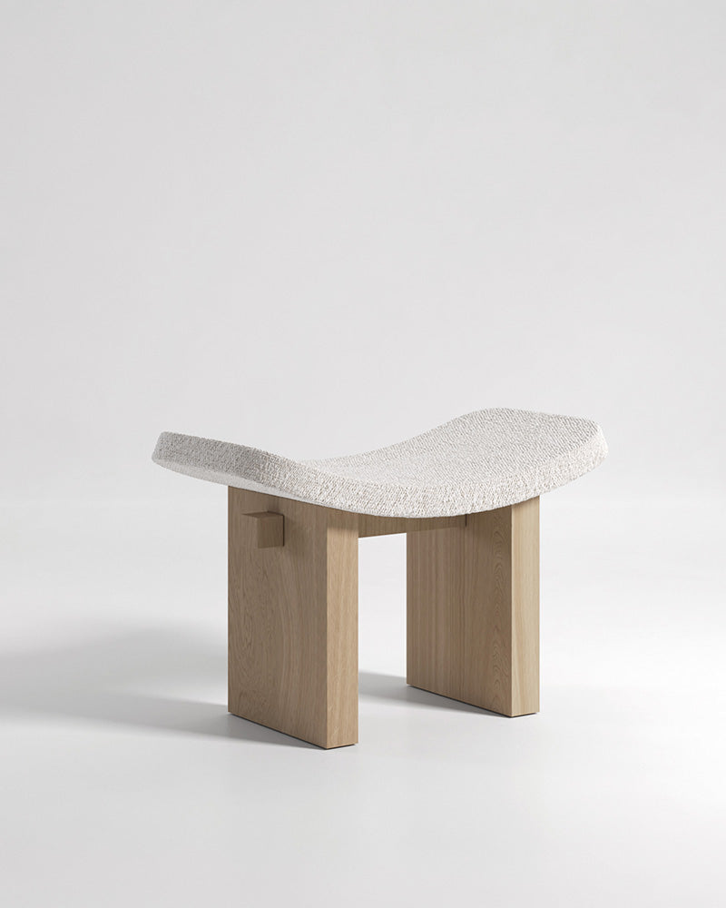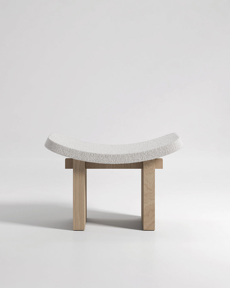 The Nara is a minimal one-seater stool, a serene architectural stool with references to ancient Japanese forms and temples. This piece is designed to be an object of quiet contemplation, with a grand presence created by the dialogue between its strong, straight-lined base and its soft, curved upholstery.