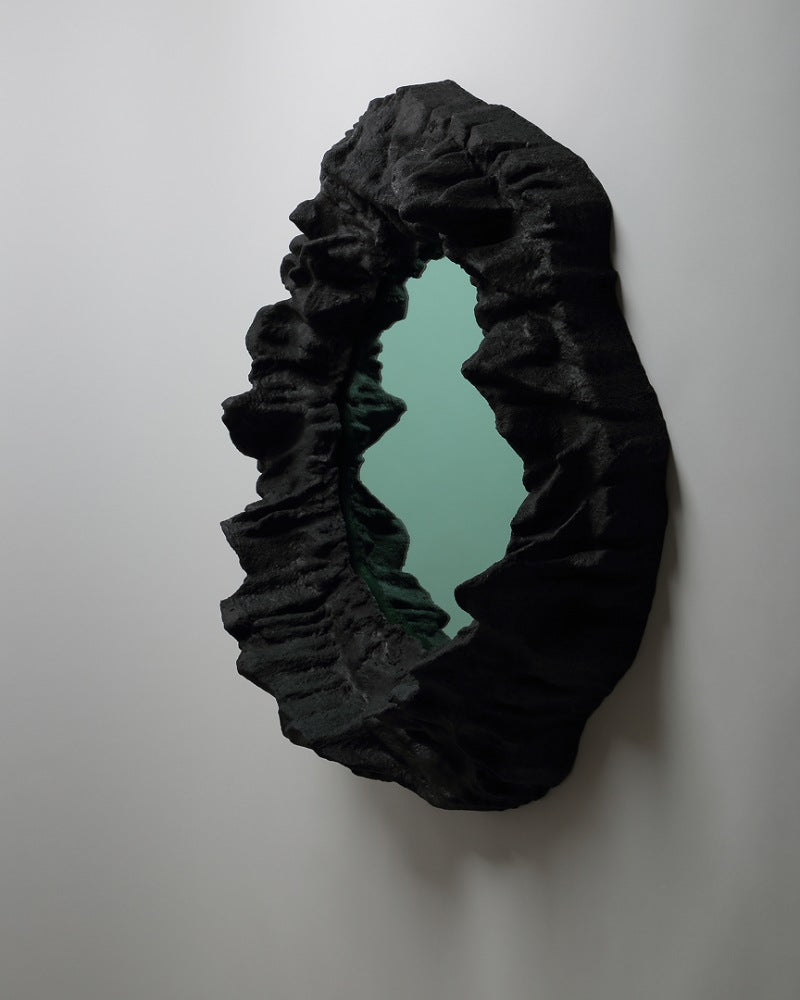 Handcrafted through a 3D carving process, this unique sculptural mirror features an organic frame made from foam, fiberglass, and lightweight concrete plaster, recreating the wild, textured surface of a volcano or glacier. This dramatic frame surrounds a custom tinted green mirror, giving the reflection a mysterious, aquatic depth reminiscent of a hidden lake. More than just a mirror, it is an invitation to contemplate the variations of the self and the perturbations of the planet, a call to dive within.