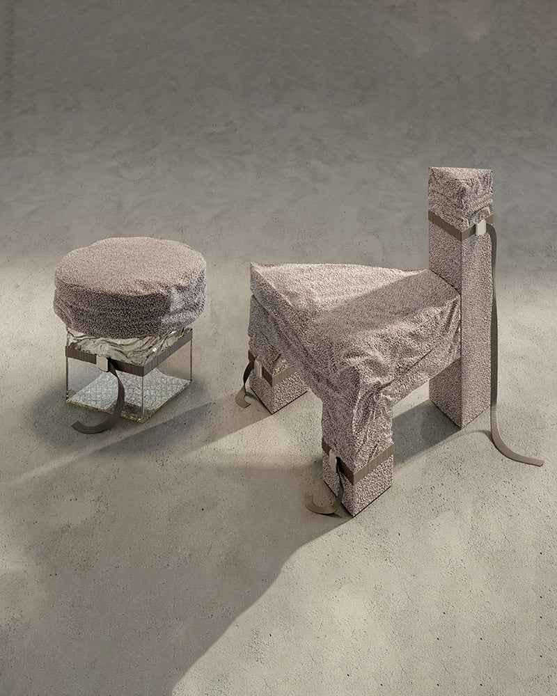 This statement piece is fully concealed with an oversized fabric, a physical interpretation of overconsumption. This excess material is compressed and restrained by a signature belt, a detail that introduces tension and highlights the designer's call to rethink and reduce. This unique conceptual chair is not just a seat, but a piece of social commentary, transforming a functional object into a conversation starter. Handcrafted in Beirut, this limited edition chair is an investment in important contemporary design. Its provenance and value are guaranteed by a certificate of authenticity signed by the artist.