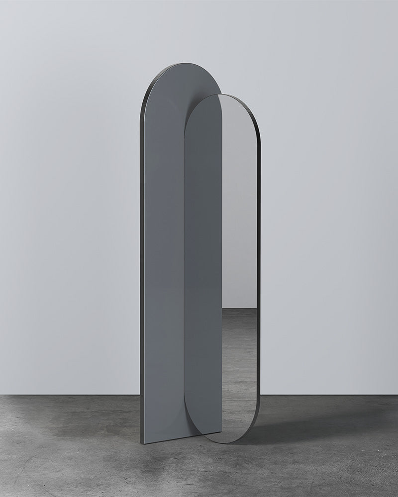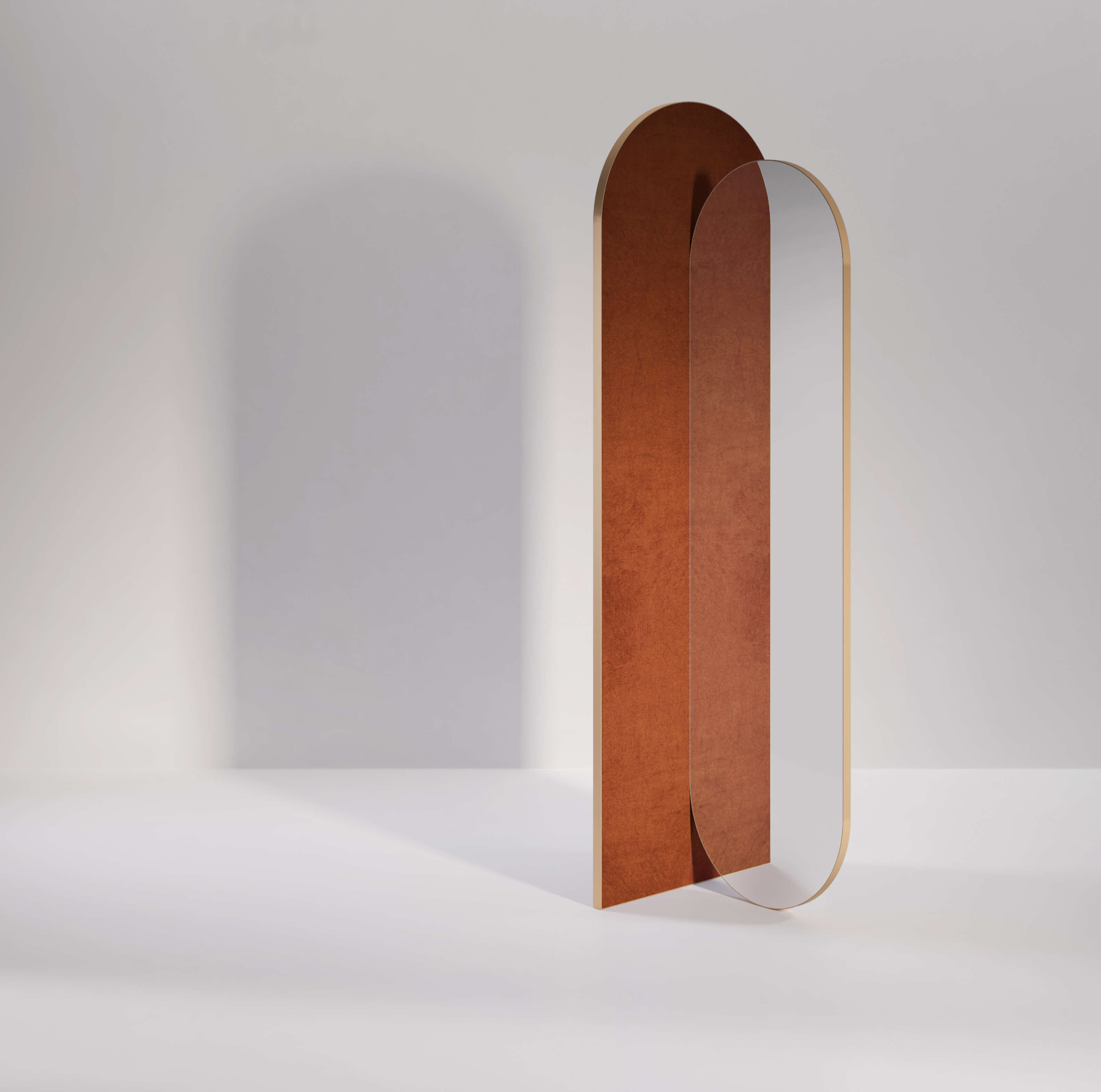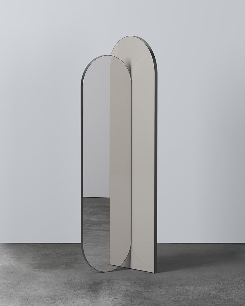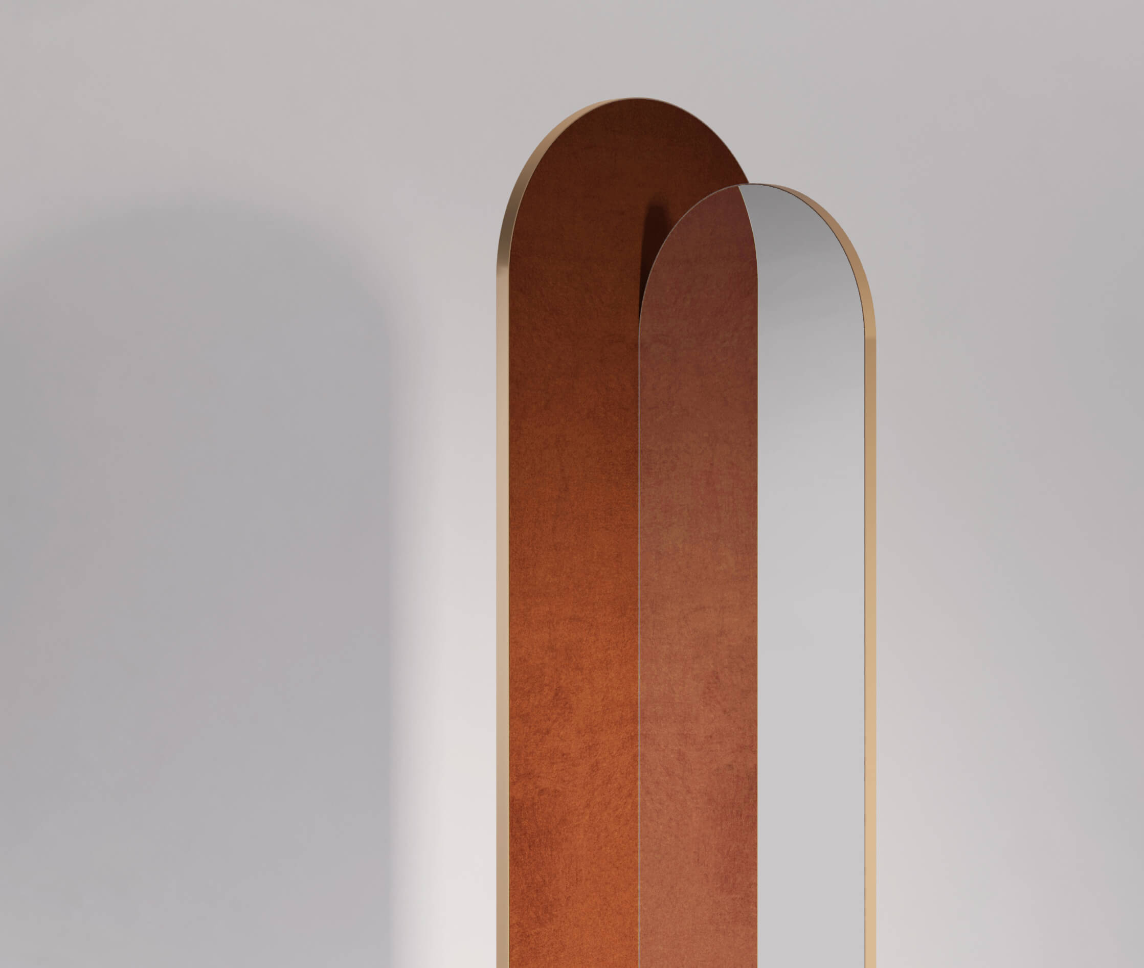 The Takada is a masterpiece of architectural poetry, a unique sculptural floor mirror made stable only by its connection to a separate, supporting arch. Both the mirror and the arch are wrapped in a metal band, creating a dialogue between two distinct yet unified forms.