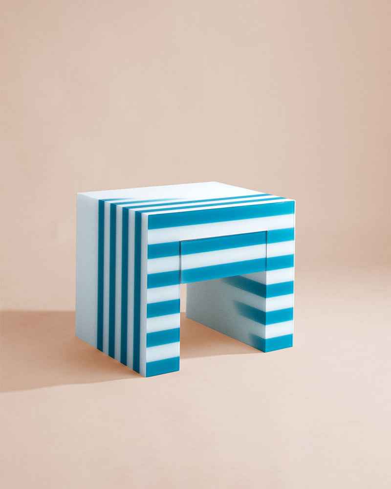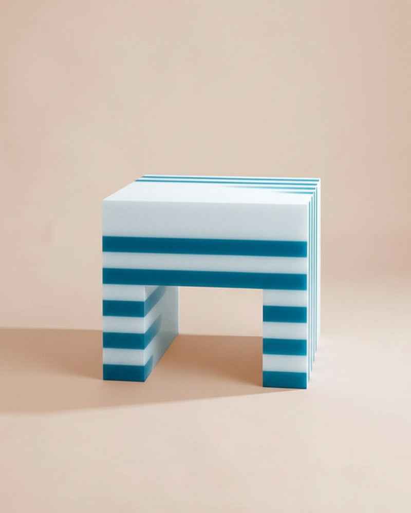 The Haidar by Adrian Cruz is a multipurpose masterpiece, a versatile geometric side table inspired by the geometry and marble bichromie of Italian Renaissance cathedrals. This object is a study in contrasts, where rigorous, geometric green and white lines merge within the translucent resin, dissolving to create an organic flow of colored matter.