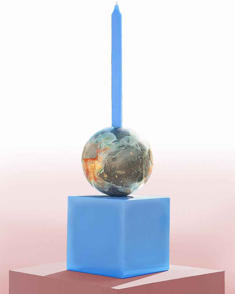 The Pianeta is a masterpiece of geometric poetry, a unique designer candle holder for the contemporary interior. This piece is a dialogue between two pure forms, the sphere and the cube, and two juxtaposed materials: a sphere sculpted in precious Mexican onyx and a cube cast in translucent colored resin.