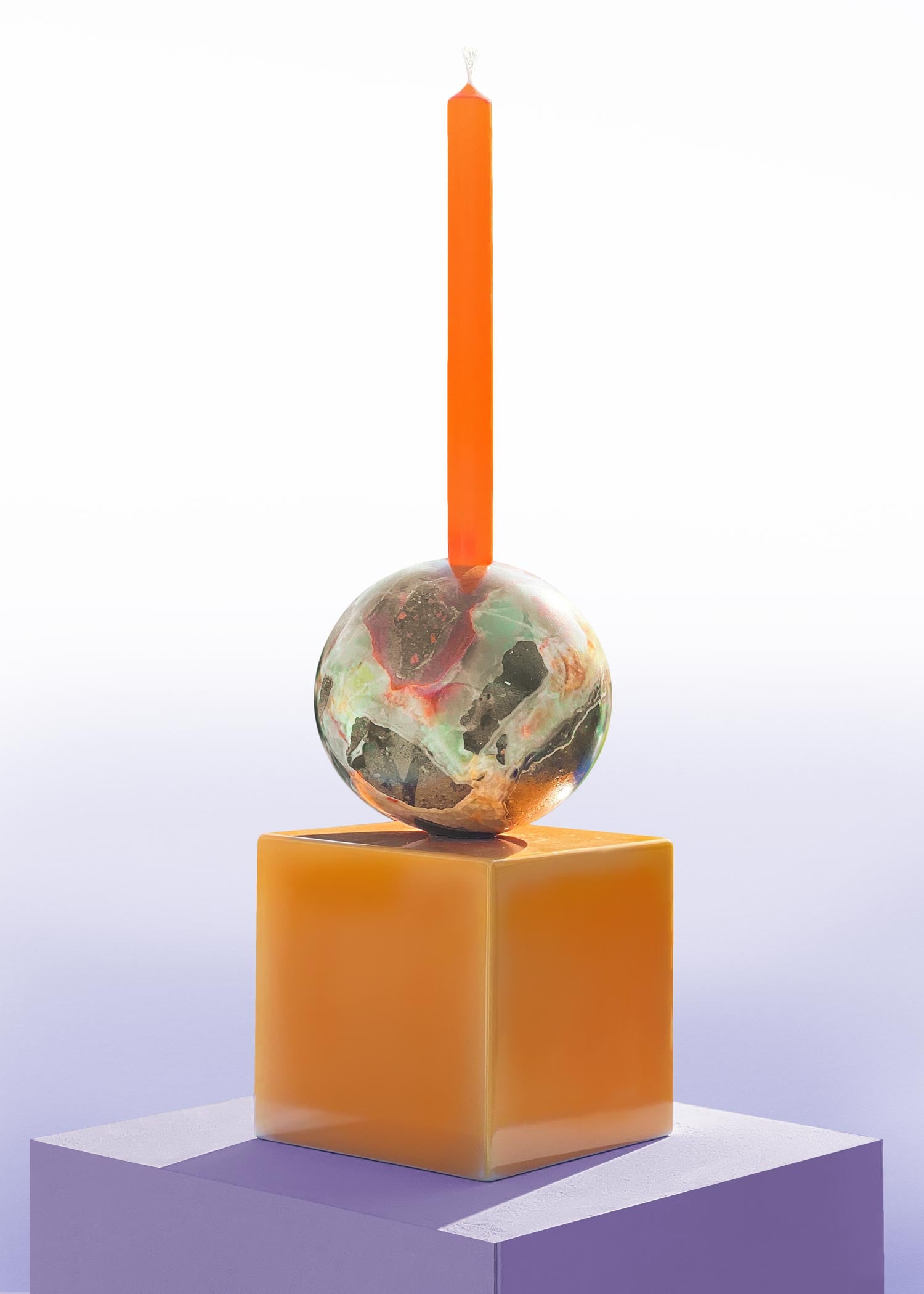 Decorative candle holder with a colorful sphere and an orange candle on a white background