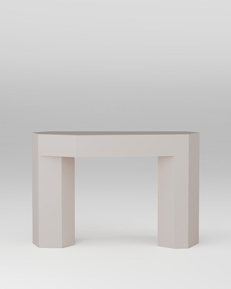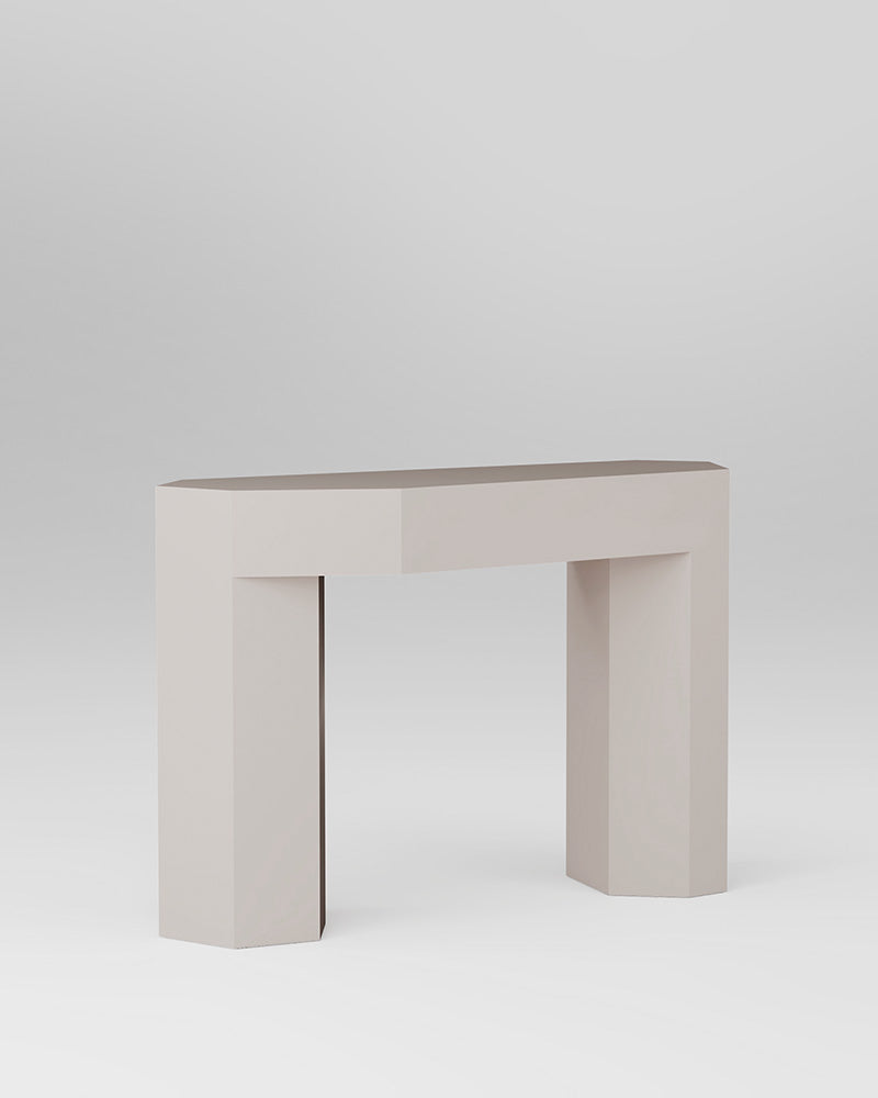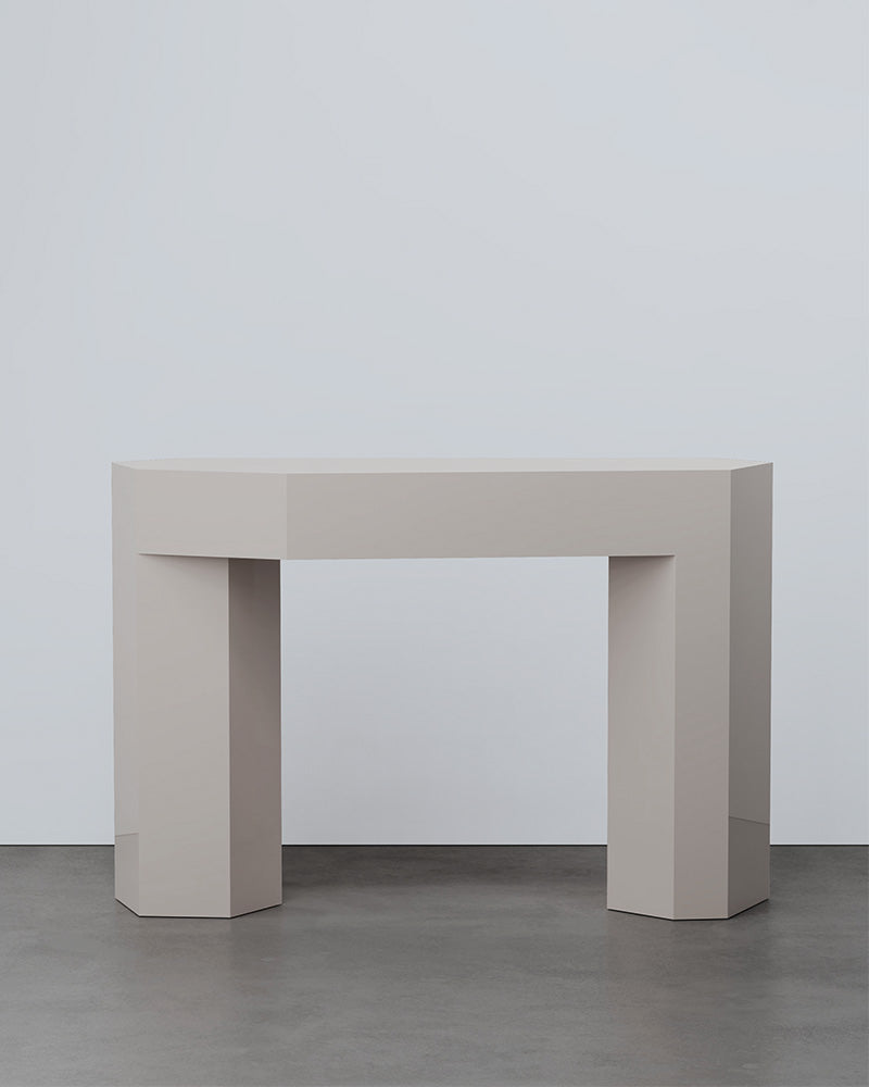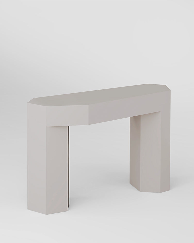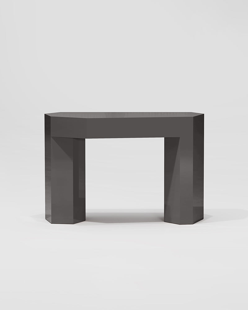 The Lock is a monolithic object, a powerful architectural console table that stands as a single, unified part. By losing the hierarchy between top and legs and allowing the would-be pieces to unify across common angles, three parts become one sculptural, yet minimalist console.