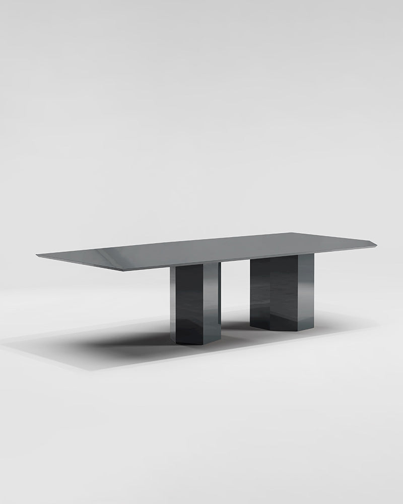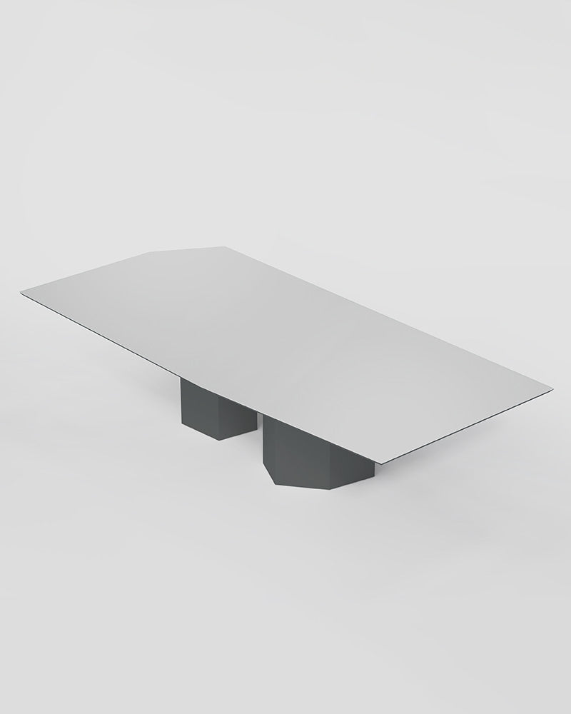 This is more than a table; it is an object of intellectual design. As a premier architectural dining table, its beauty lies in its confident asymmetry and its celebration of imperfection. The two powerful, faceted legs support a mirrored top with unconventional angles, creating a piece that is both visually arresting and perfectly functional.