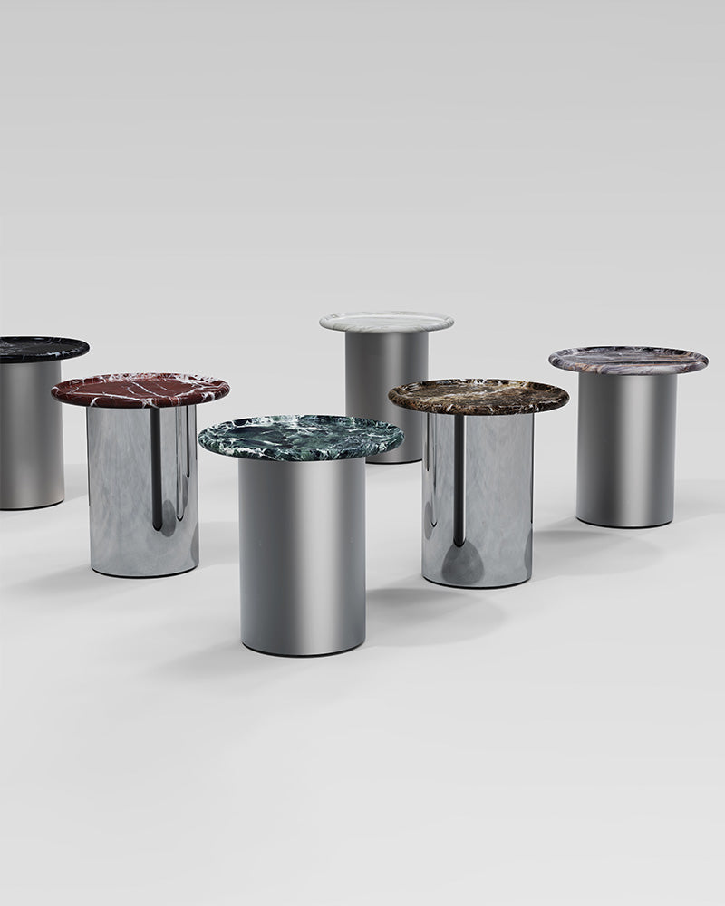 The Orbitae is a masterpiece of material purism, a minimalist marble side table designed to highlight the singular beauty of natural stone. Each unique marble top, with its complex patterns and veins, is supported by a simple metal pedestal designed to disappear, creating the illusion of a floating, orbiting plane.