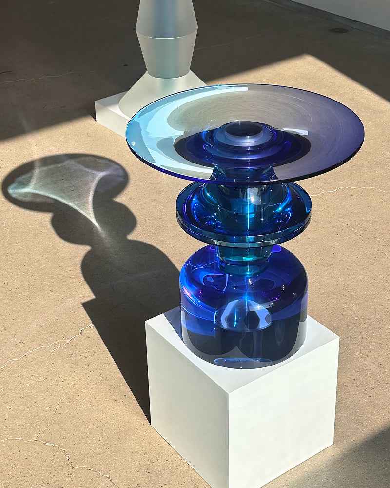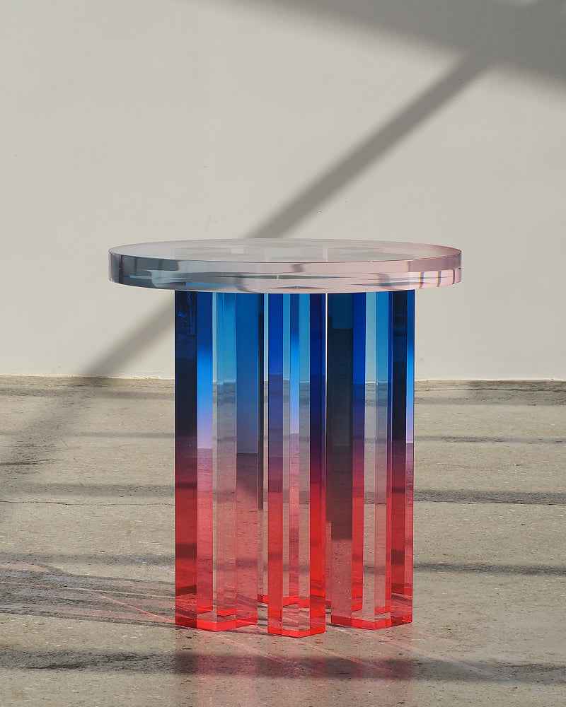 Through acrylic resin, carefully dyed and cast, he builds straight lined structures and gradient planes that feel at once minimal and emotive. Each piece is the result of precise molding experiments and patient, hand applied color work, turning furniture into sculptural objects that sit between design and art. His language is defined by clarity, transparency and calm, offering contemporary collectible design pieces that act as visual fragments of a single day, a sky, or a remembered landscape.