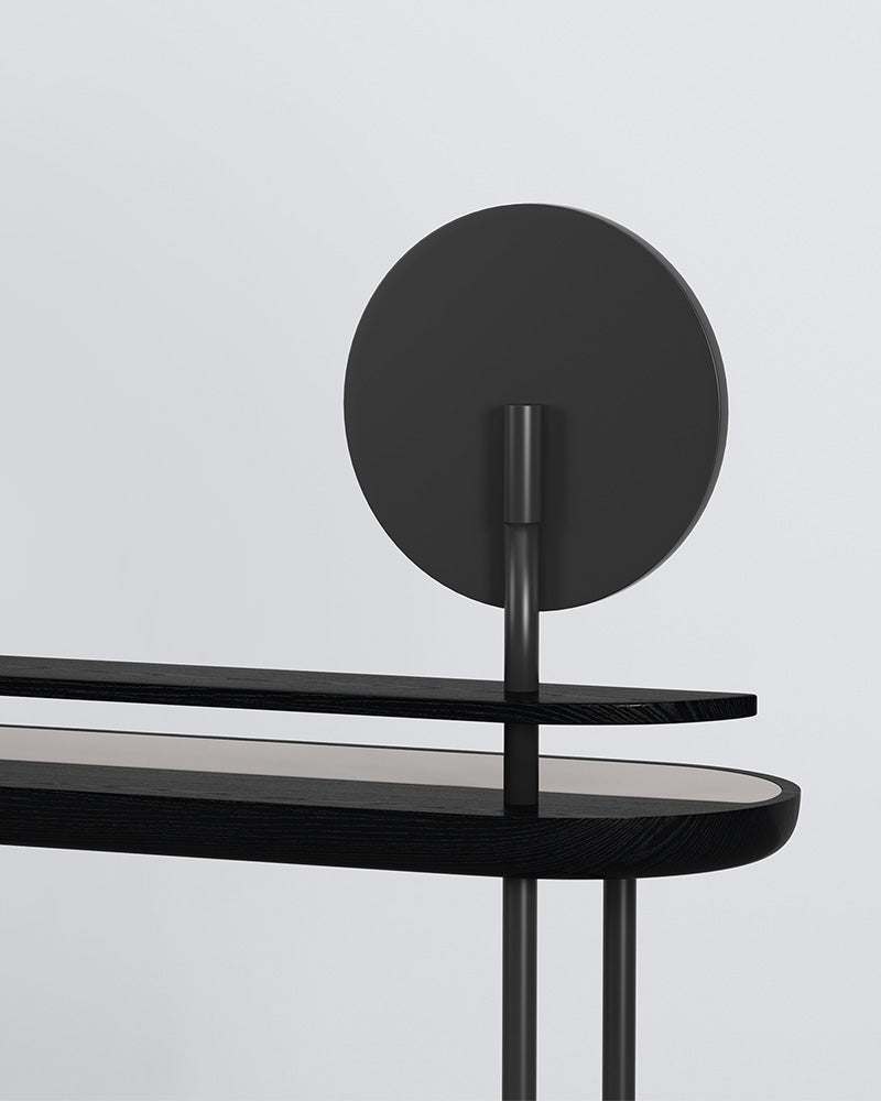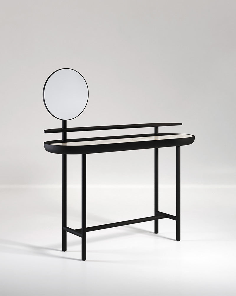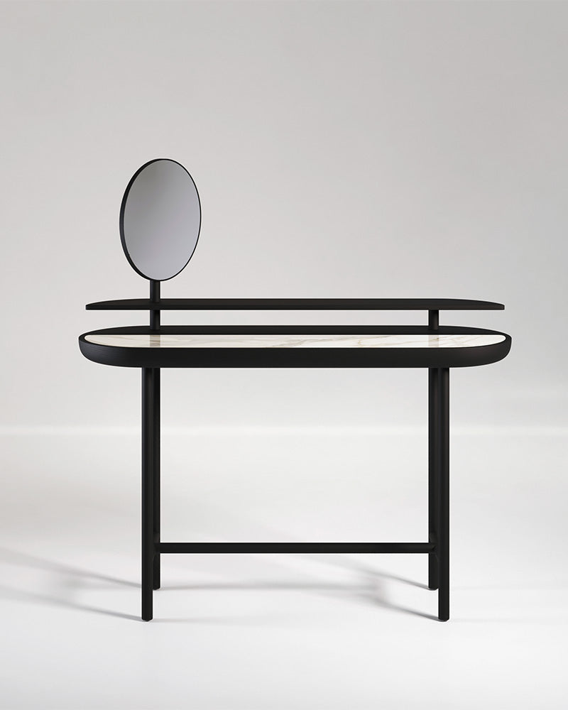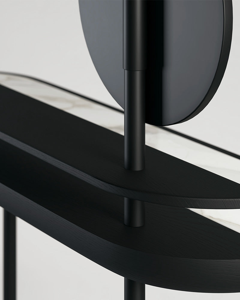 The Apollo Desk is a masterpiece of balance and function, a unique designer dressing table that redefines the modern vanity. With two levels and a 360-degree rotating mirror, this minimal piece draws inspiration from the concept of yin and yang, creating a perfect harmony of wood, marble, and metal.