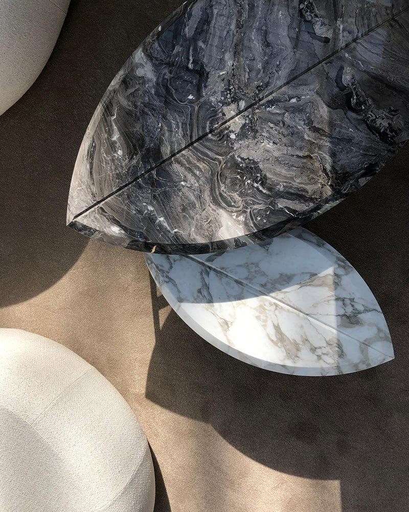 The Book tables are a poetic masterpiece, a unique marble and metal coffee table set designed in the shape of two giant leaves. This piece is a testament to natural beauty and artisanal craftsmanship, with the veins of the book-matched marble mirroring the veins of a leaf.