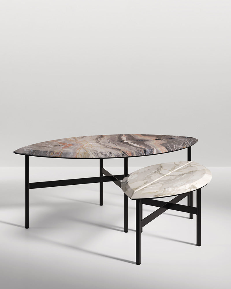 This is more than a set of tables; it is an object of functional art. As a premier marble and metal coffee table, its beauty lies in the flawless execution of its concept. The two leaf-shaped marble tops, available in various natural stones, rest on a minimal welded steel structure,Handcrafted in Italy, the Book tables are a testament to sophisticated design.
