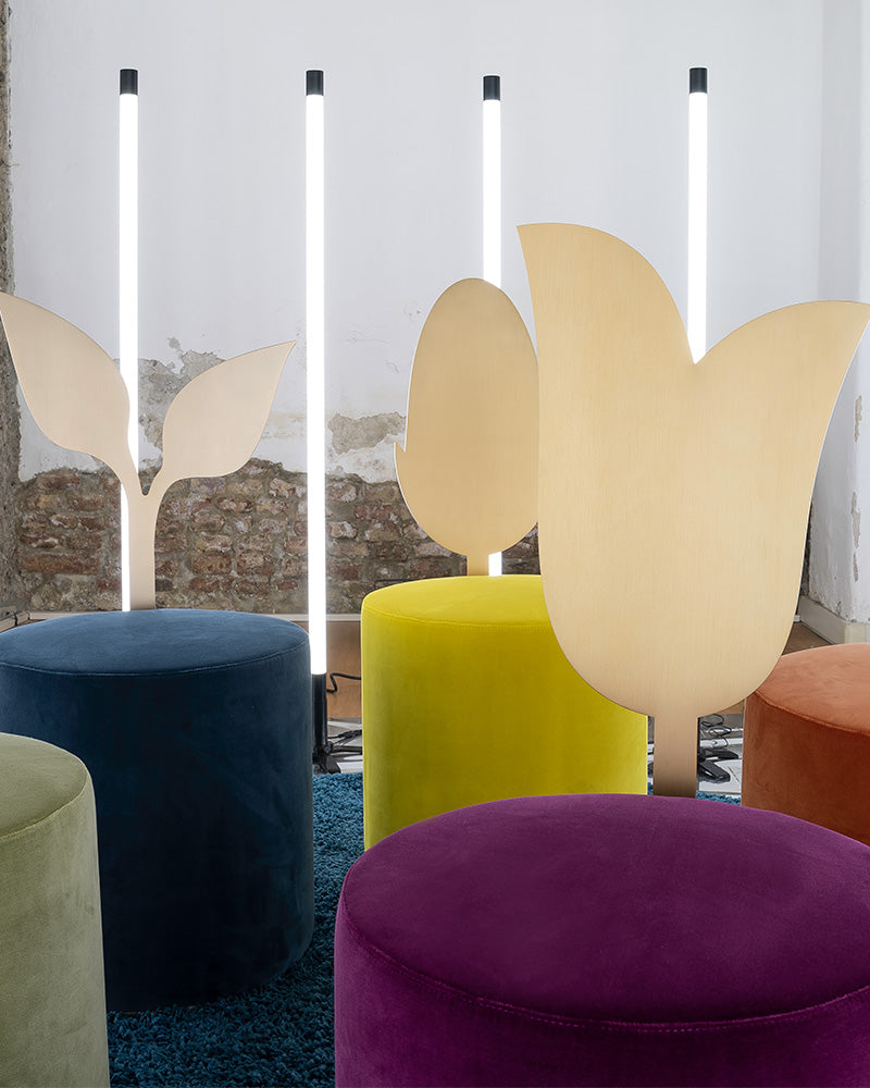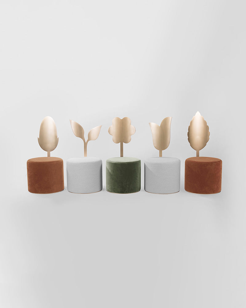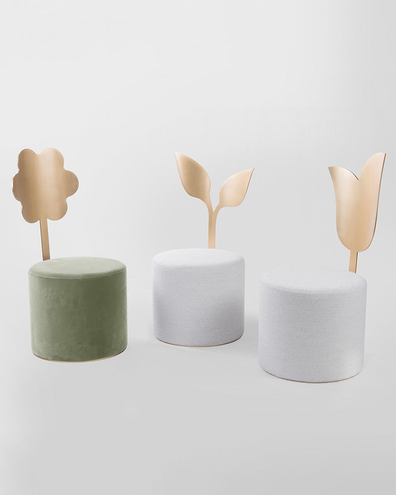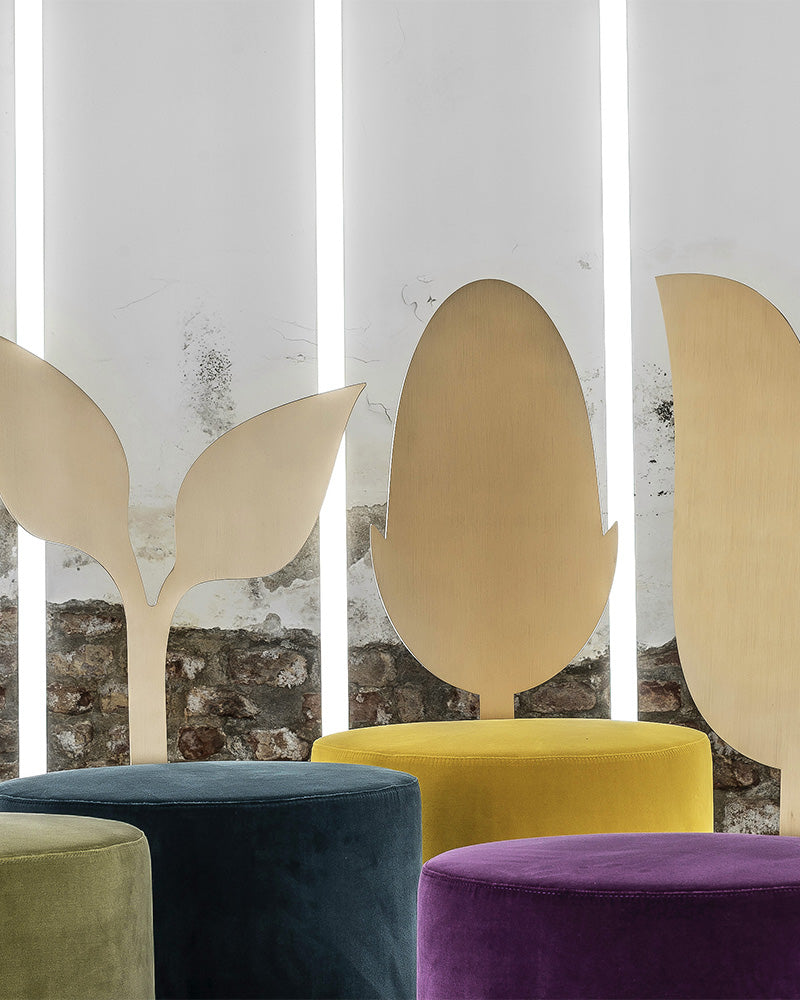 The Giardino Botanico is a poetic exploration of nature, a unique collection of sculptural pouf designs for the contemporary interior. The collection features five distinct pieces, each with a backrest inspired by a different botanical shape—the Lily, Ivy, Daisy, Jasmine, and Holly—creating a whimsical yet sophisticated indoor garden.